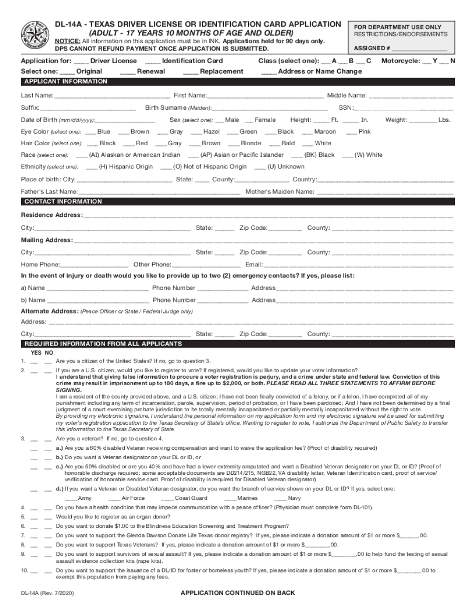 Tx Dl 14a 2020 2021 Form Printable Blank Pdf Online